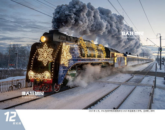 2025年1月,俄罗斯圣彼得堡,P36型蒸汽机车推挽牵引2025次圣诞老人专列高速通过谢尔吉沃车站。