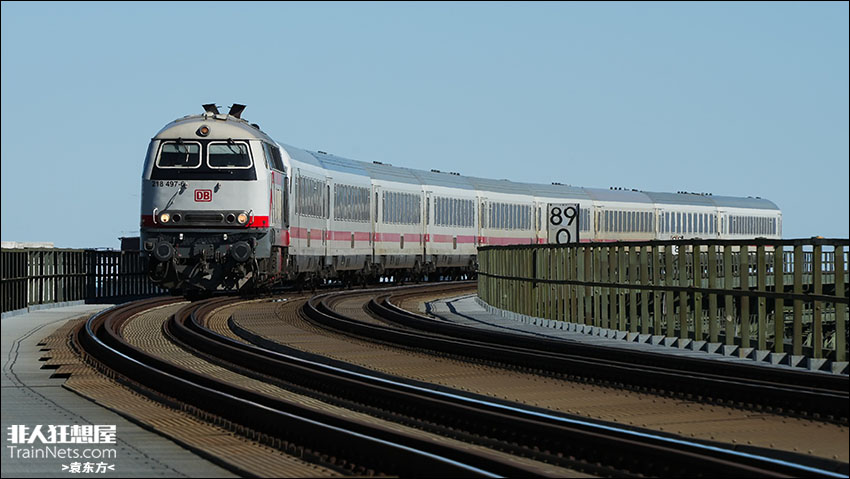 2025年3月,德国石荷州,218型内燃机车牵引的IC行驶在Hochdonn高架桥上,驶向叙尔特岛。