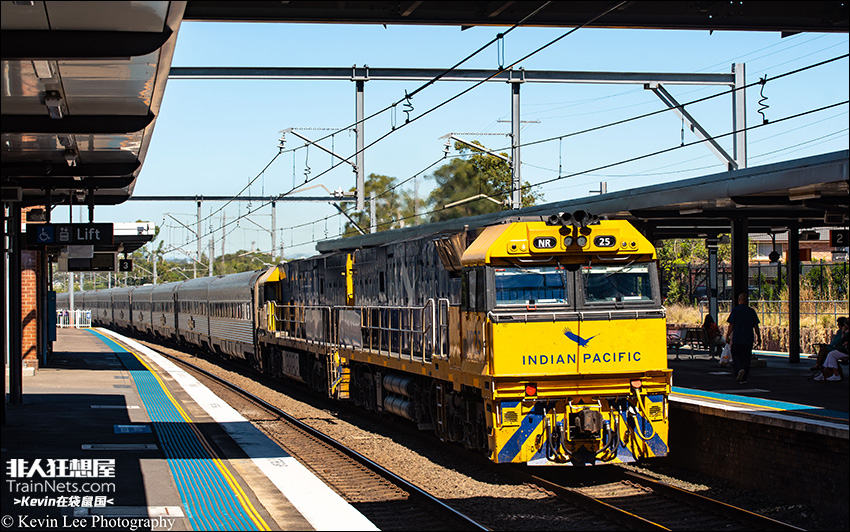 2025年11月19日,内燃机车NR级(印度洋-太平洋涂装)牵引著名旅游列车“印度洋-太平洋号(Indian Pacific)”通过悉尼城铁杜恩赛德车站(Doonside Station),将在不久后抵达终点悉尼车站,结束4天的旅途。该车是日编组2节NR级内燃机车+33节不锈钢客车。每次该列车途径悉尼城铁路网都堪称奇观——动辄35节的超长客列驶过大约仅能容下8节列车、200米长的通勤列车站台,长度对比实在太明显。