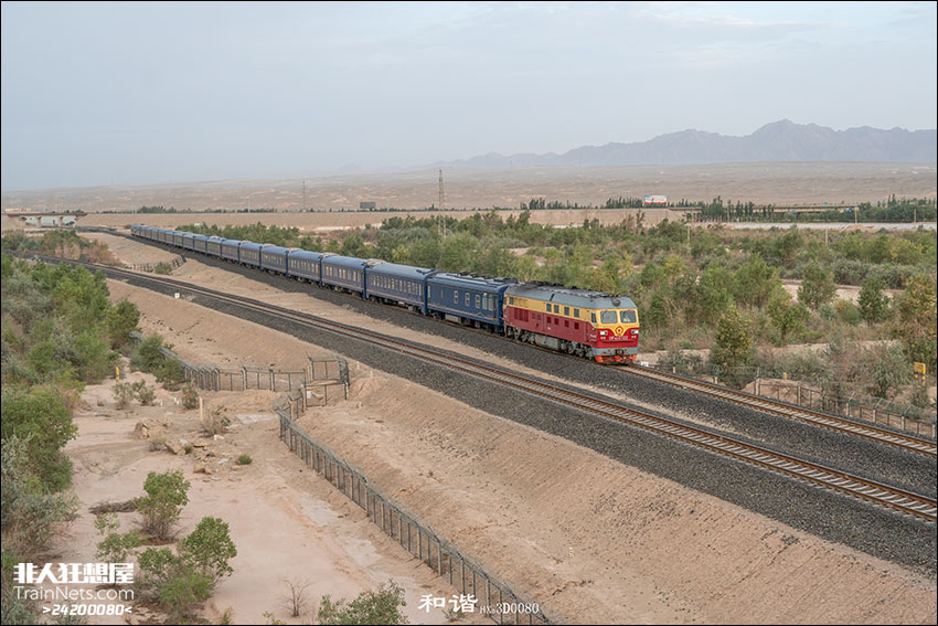 2025年7月。南疆线。乌局库段DF4D牵引Y642次(喀什-库车)“成都号”旅游列车出库车西站。