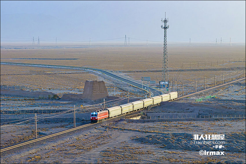 2023年9月。夕阳下苍茫的河西走廊,兰局嘉段韶山7E型电力机车牵引7530(镜铁山-嘉峪关)穿越明长城西端末梢和长城第二墩。