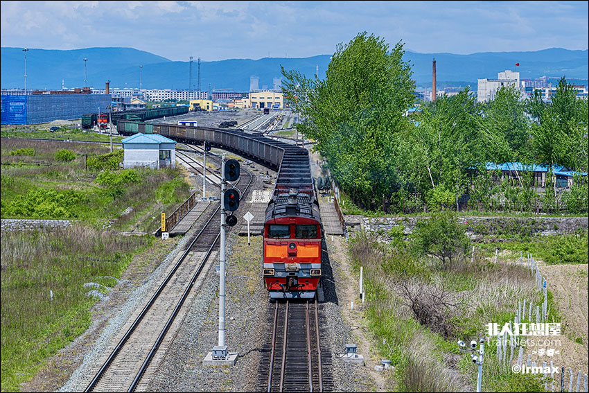 2021年5月29日。中俄四大铁路口岸之一:珲春地方铁路珲春南站,俄铁货运列车正在出站返回俄罗斯滨海边疆区,经由哈桑支线,在乌苏里斯克汇入西伯利亚大铁路。图中可见同绥芬河类似的宽轨准轨套轨。