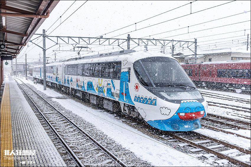 2026年2月。日本。大雪纷飞的富士山下,往返于河口湖与大月站间的富士急行线8000系特急列车正存放在存车线,该车车身上的富士山卡通造型与大雪相衬颇有美感。