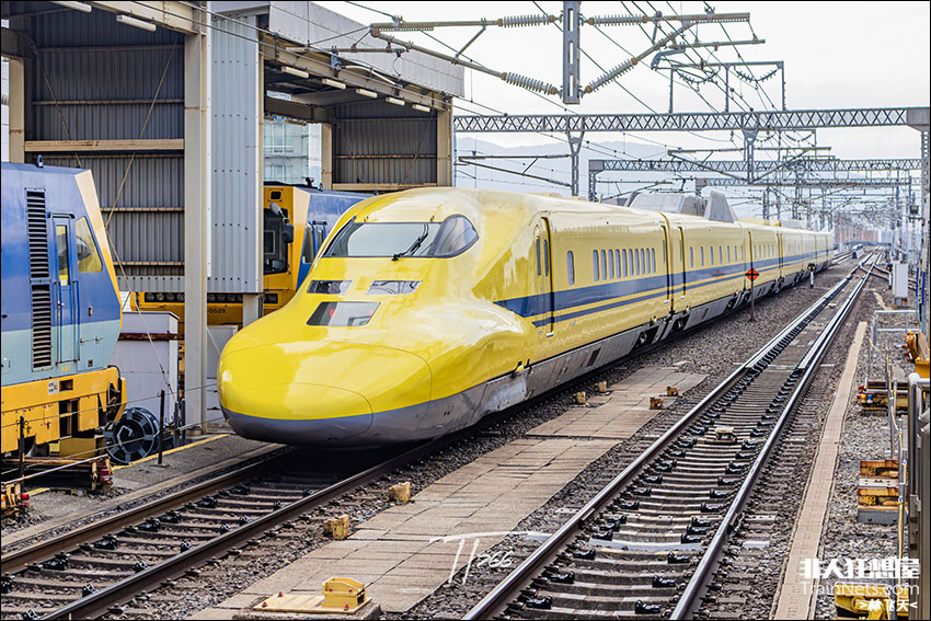 2026年2月。日本京都。新干线黄医生动检车923系T5编成驶出京都站13站台,正进行JR山阳新干线检测任务,往新大阪方向。