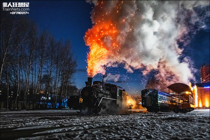 2025年12月29日。日本铁路迷在桦南森铁蒸汽小火车包车,并表演喷火。