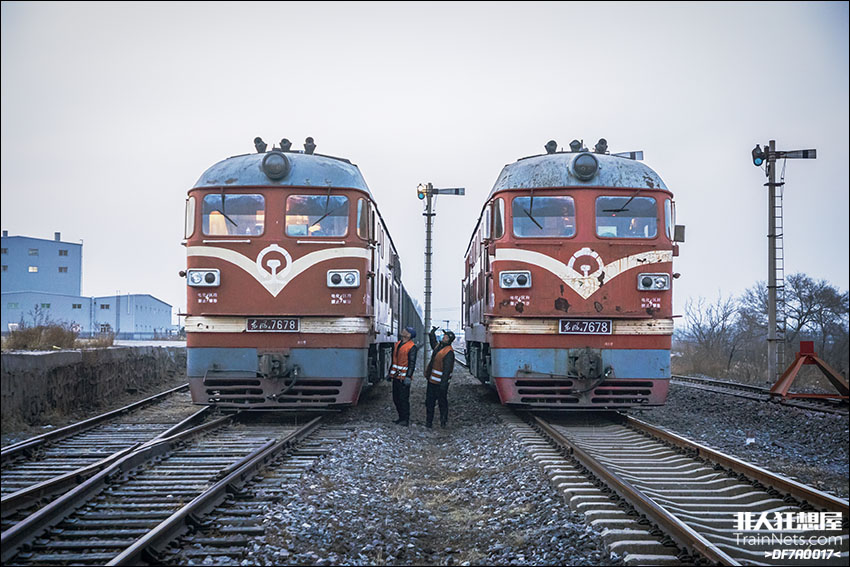 2026年2月25日。辽宁朝阳北票北保铁路,两台DF4-7678(右侧DF4-7774改)并排停在老式臂板信号机下。
