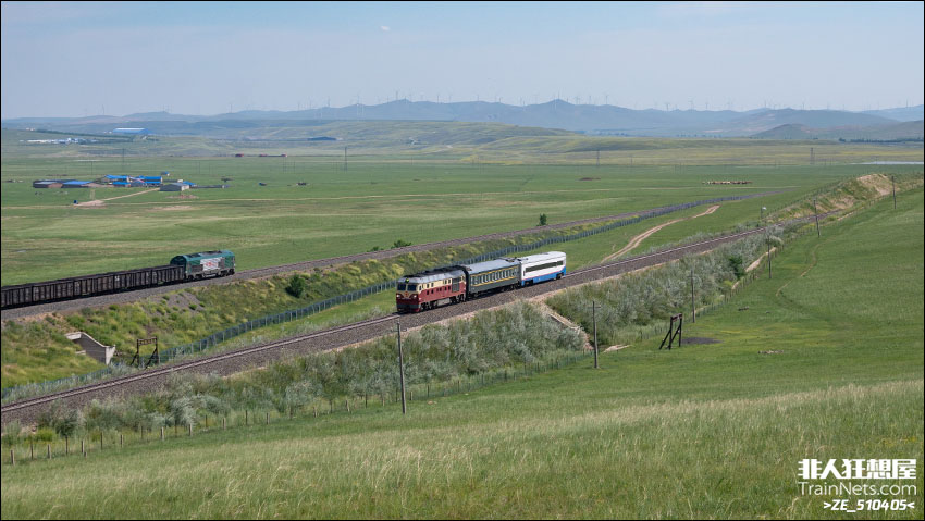 2025年7月23日。锡乌铁路。锡乌线月度检57282次宝日格站接近,交汇霍白铁路上行货车,当月使用999423原色检测车。
