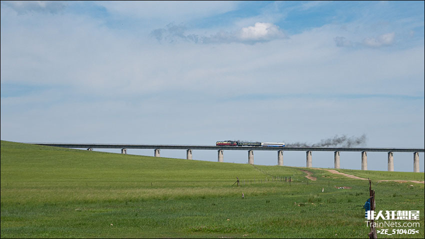 2025年7月23日。锡乌铁路。锡乌线月度检57282次喷烟通过宝日格大桥,当月使用999423原色检测车。