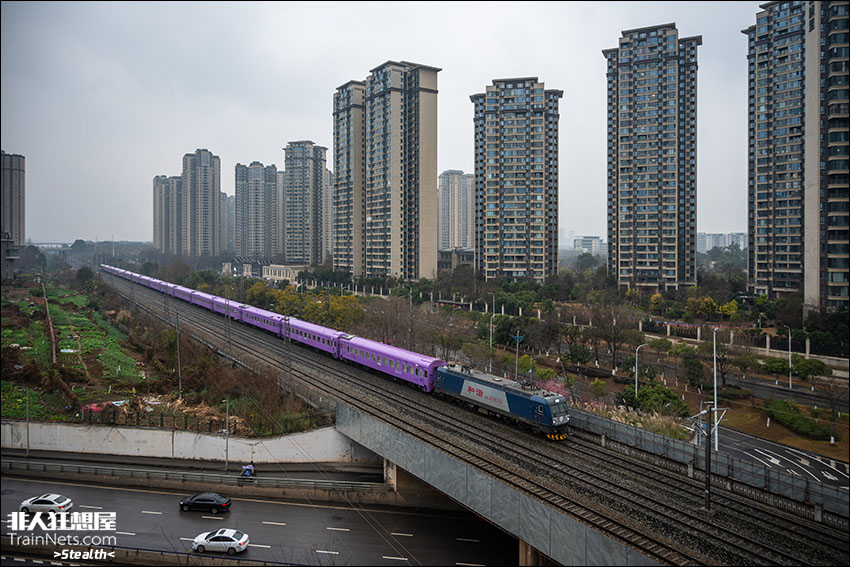 2026年1月,四川成都,成渝线,上线初期的“锦绣山河·多彩贵州号”成都局旅游列车开行Y984次前往巴中,在蒙蒙阴雨里接近龙潭寺站。
