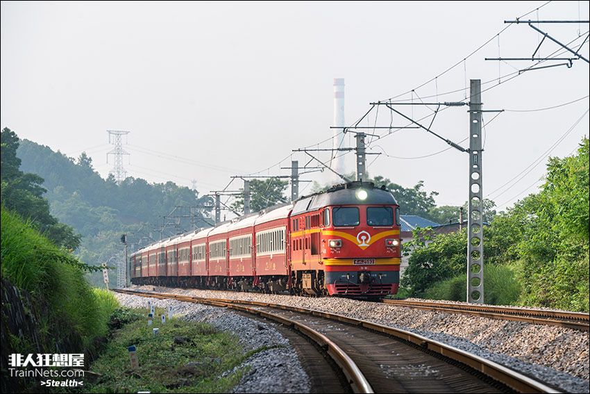 2025年6月,湖南邵阳,益湛线,广铁怀段DF4机车牵引“我的韶山行”研学专列通过电厂线并行区间,难得使用的“橘子“机车编组让列车在夕阳下更为美丽。
