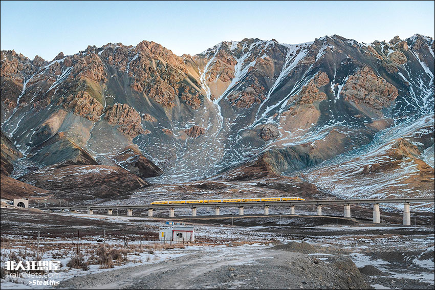 2026年1月,青海门源,兰新客专,CRH5J-0501动检列车迎着日出行驶在祁连山下,到达世界高速铁路最高点——祁连山1号隧道。