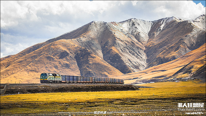 2025年10月,青藏铁路。雪山脚下的NJ2牵引货列,踏着金秋的青藏高原,驶往那曲方向。