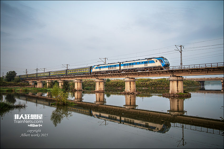 2025年9月13日,客车Z17次(北京-齐齐哈尔)接近京哈线一间堡站,水面倒影显得清晨京哈直特尤为美丽。