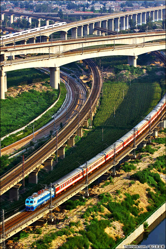 2015年8月16日。京广铁路石家庄-平南间。SS8牵引K267次通过。京广线、京广高铁、石太客专、京广高铁-石太客专联络线、动车所走行线以及石家庄西环线在此交会。(图/石门王立柱)
