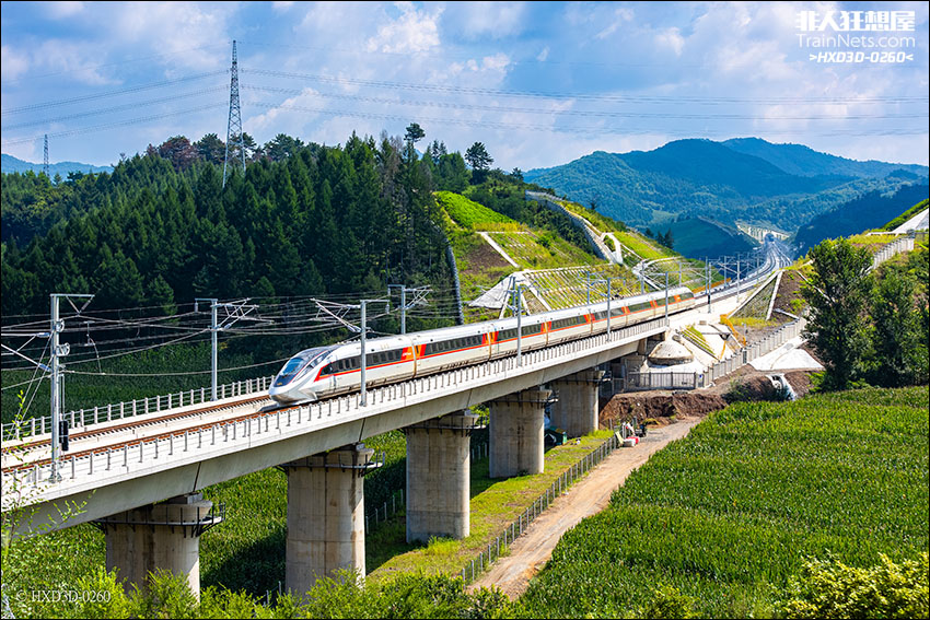 2025年8月26日,沈白高铁。CR450AF-0201担当DJ55837次由抚顺站发车,达速钻出隧道前往通化站。