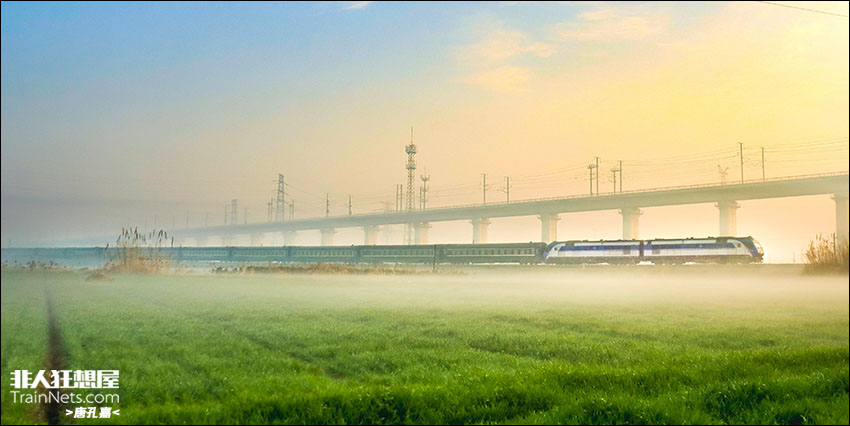 2026年2月14日。江苏海安西北联络线附近,客车Z51次(北京-启东)迎着朝霞通过新长正线即将抵达海安车站。