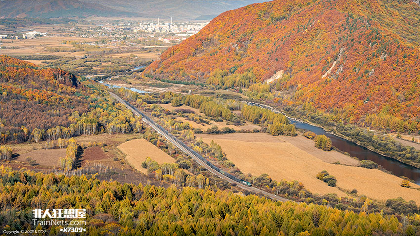 2025年10月,绥佳线,HXN5牵引货列走行在秋意深浓的小兴安岭,接近绿潭站。