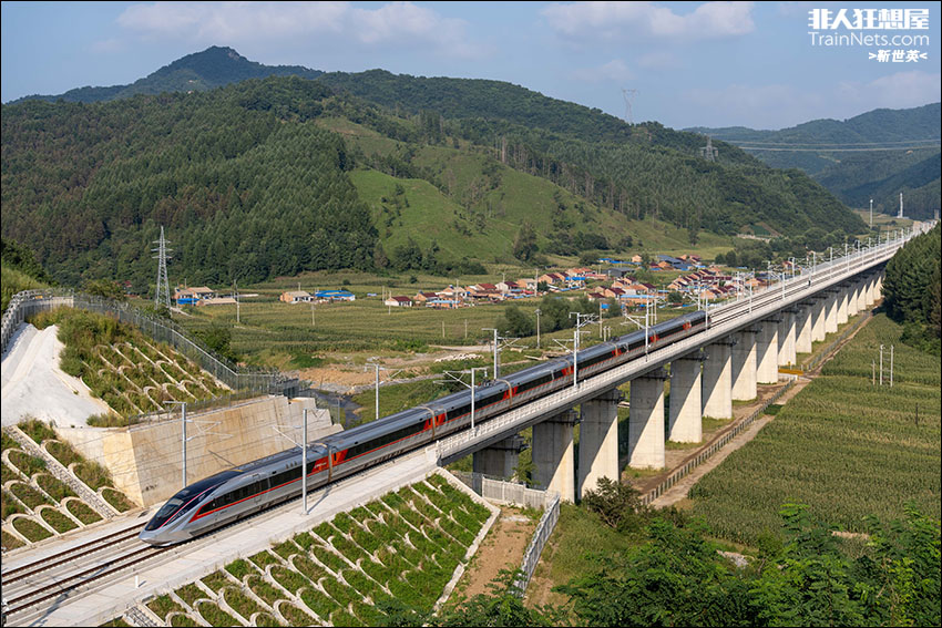 2025年9月1日,沈佳高铁沈白段,四方股份样车CR450AF-0201担当DJ55843次(抚顺-通化)驶出西古隧道,接近东韩家站。