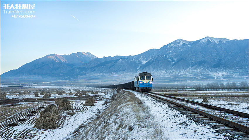 2026年1月。沙蔚铁路DF4D牵引货列驶过雪山脚下。
