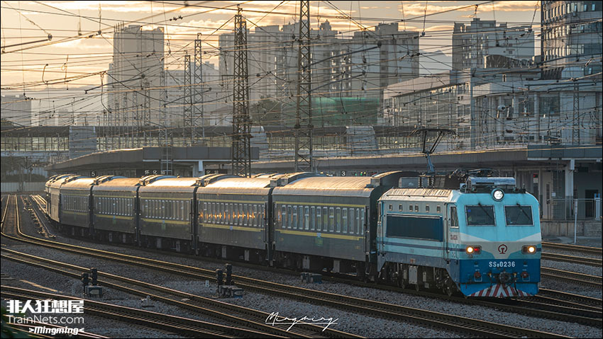 2025年10月2日,湖南怀化,朝阳下的广铁长段SS8-0236牵引7269次列车(怀化-塘豹)缓缓驶离怀化站去怀化西方向。