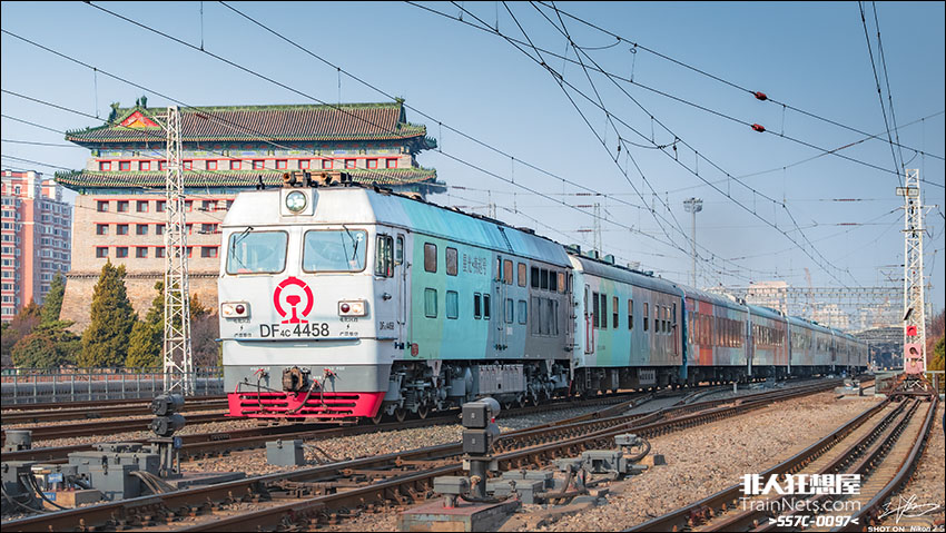2026年3月15日。北京东城。京局怀段DF4C-4458牵引北京铁路局特色彩绘旅游列车“星光·燕赵号”出北京站,与北京城东南角楼同框。