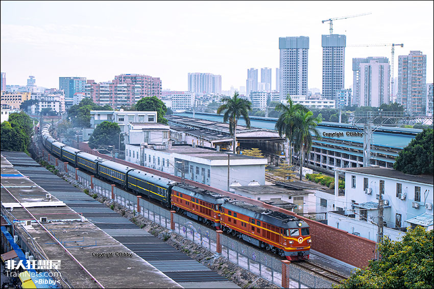 2025年12月16日,双机DF4B牵引K1208次(深圳东-昆明)驶出广州站,逆行京广线接近广州白云站。