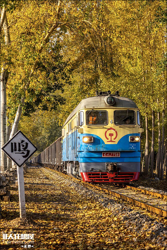 2025年11月15日,抓住秋天的尾巴,老东风与杨树林的秋日邂逅,大宋铁路DF4BD-7758牵引全列敞车通过8公里道口。