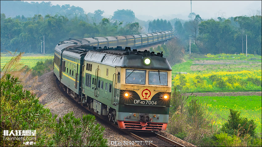 2026年2月。广西桂林。湘桂线。 春运节后客流高峰即将到来,为满足大量旅客出行需求,“柳州虎”DF4D‑7004号机车牵引旅客列车车底,组成专列南下回送。