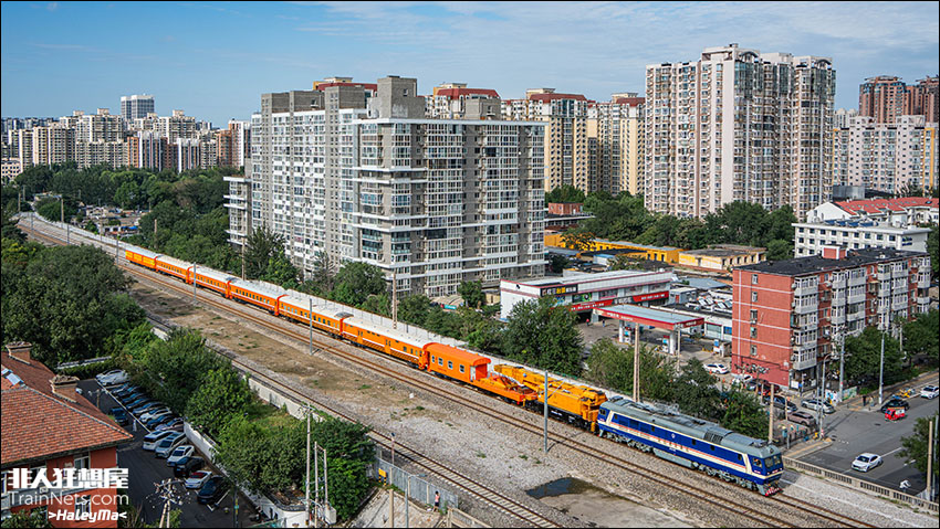 2025年8月。百星线。东风8B牵引完成保障任务的救援列返回丰台西站。一道鲜艳的橙色从高楼林立的住宅区中穿过,格外醒目。