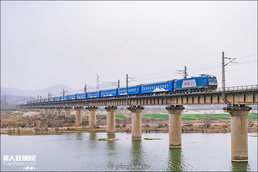 2026年正月初七,武局襄段HXD3C牵引编有成都局特色旅游车底“岷江号”的春运临客K4571/2次(东莞东-成都西),行驶在襄渝一线谷城南河桥,前方即将通过谷城站。