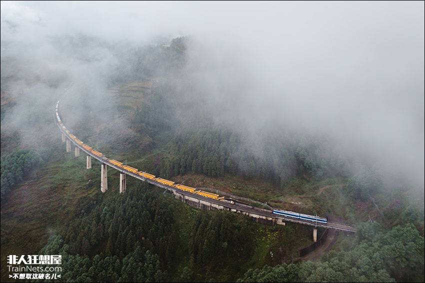 2025年11月,内六线彝良展线,运送大机的路用列车穿过云海,正在第二层展线缓缓下山。