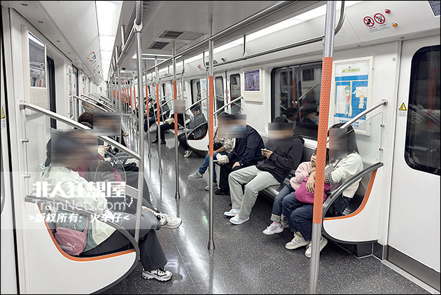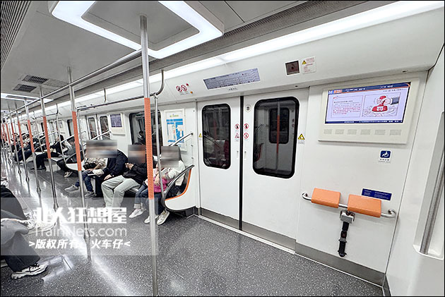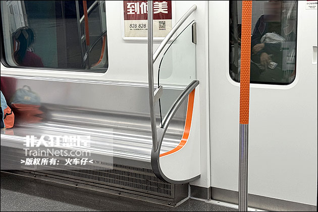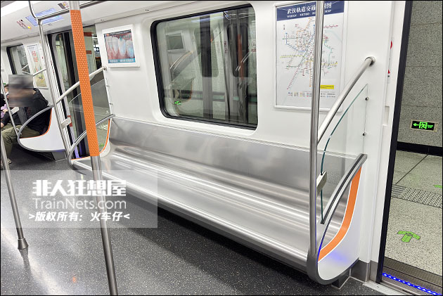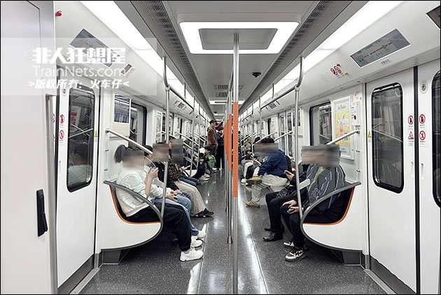 列车外观延续 7 号线 “黄鹤之势” 设计语言,主体银白色车身搭配线路标志色凤凰橙贯穿色带,与全线列车视觉体系保持统一;内饰采用浅灰色主调搭配橙色点缀,风格简洁明快,车内配备大尺寸LCD动态地图、LED车端信息屏,乘客信息展示清晰直观;车顶采用全域柔光照明,光线均匀柔和无眩光;全车扶手采用防滑喷塑工艺,座椅边角全部采用圆润化防磕碰设计,同时设置专用无障碍轮椅区域并配套安全带,全方位满足各类乘客出行需求。