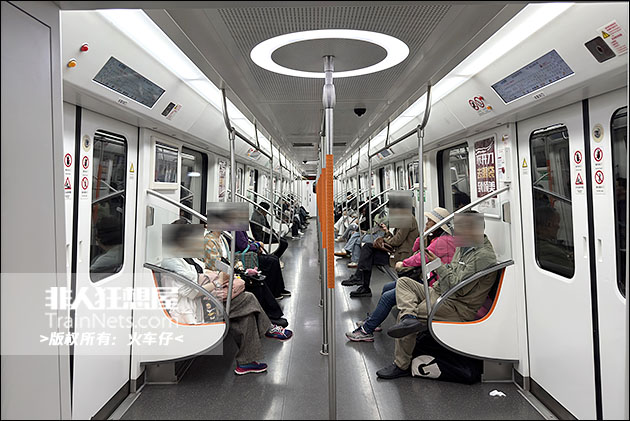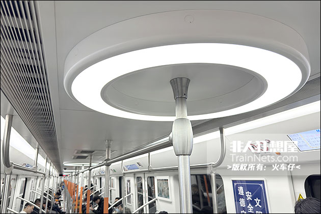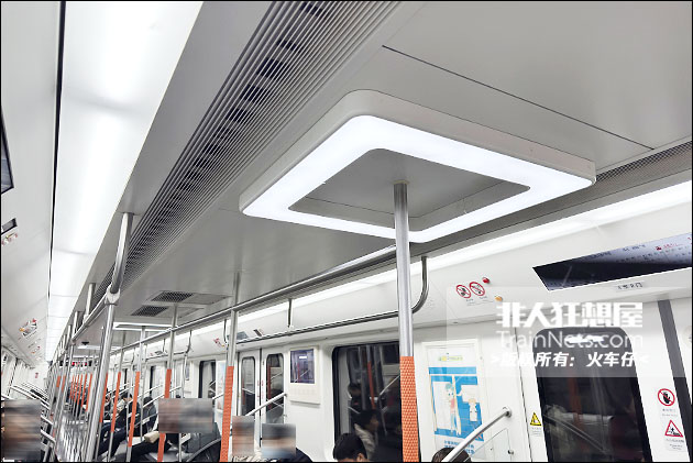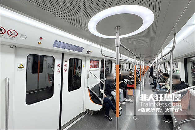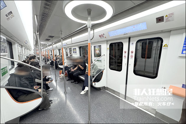 车辆内饰设计采用浅灰色主调搭配线路色 “凤凰橙” 点缀,天花布置有环形LED灯,中立柱采用喷塑压花工艺,防滑舒适。配备大尺寸LCD动态地图与LED车端信息屏。