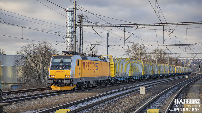 2026年1月。捷克。Regiojet涂装386型电力机车牵引货列接近Praha-Holešovice。