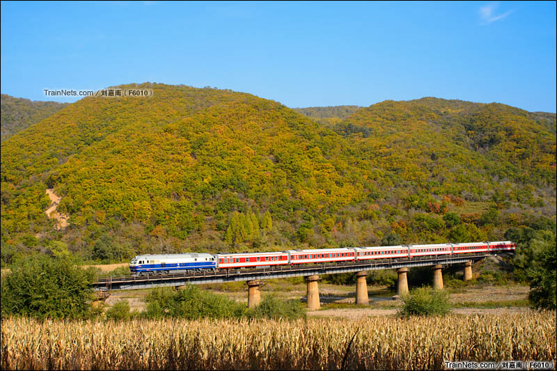 2015年10月5日。长图线,磨盘山-苇子沟区间。红皮客车行驶在老铁桥上、五花山谷中。(图/刘嘉南@F6010)