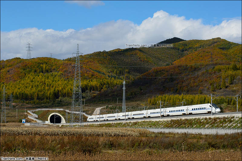 2015年10月3日。长珲城际,敦化-安图西区间。CRH5G型动车行驶在蓝天白云下、穿梭在五花山间。(图/刘嘉南@F6010)
