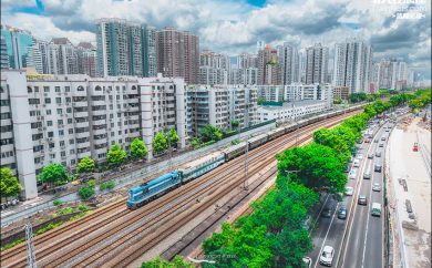 老旧列车与云下的CBD同框