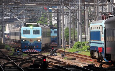 2013年7月18日。深圳站三台SS8共舞。T820次,九龙-广州东(左)开过罗湖桥进入深圳。Z24次宜昌东-深圳(右)晚点刚抵达。第三台SS8(中)等待折返。(IMG-7590-130718)