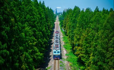 金山支线巡检列车通过水杉树林