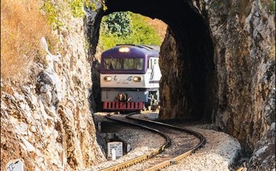 峭壁下蛇形前进的滇越铁路