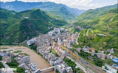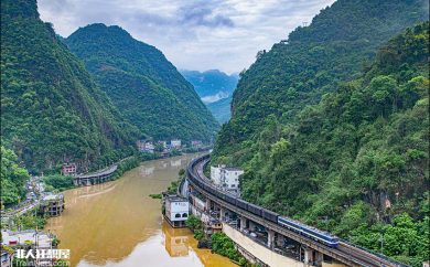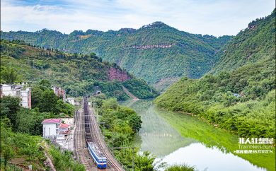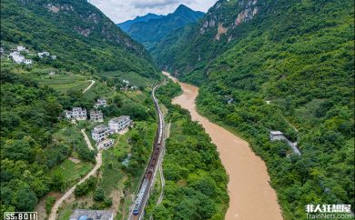 SS3B牵引货列蜿蜒在河谷中