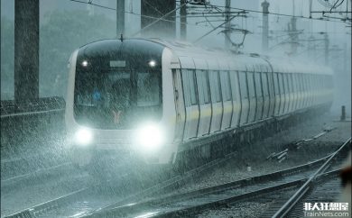 羊角1号线列车迎住台风雨驶入坑口站