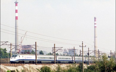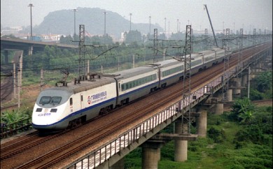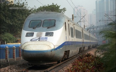 2001年,广州五山。一列蓝箭动车组从广州东站发出,开往深圳。(P0613)