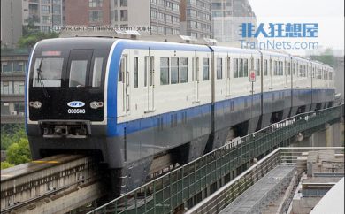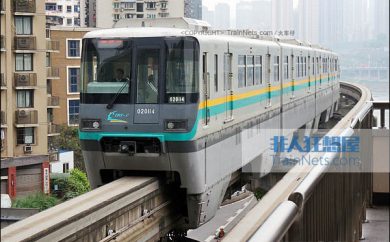 重庆轨道交通三号线列车,由重庆长春轨道公司生产的跨座式单轨列车,设计速度80km/h,列车编组6节,远期8编组。