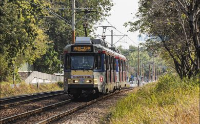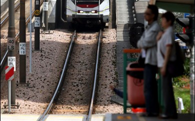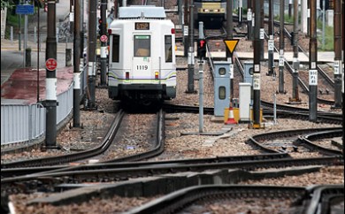 2011年10月14日。香港屯门。两辆香港轻铁615P线,屯门码头-兆康,在青云站与鸣琴站区间交汇。(IMG-0940-111014)