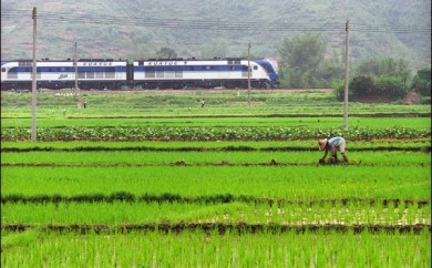 2008年4月。广东云浮新兴县天堂镇。K511,上海南-三亚列车在农田间驶向海南。(B7613)