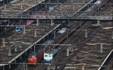 2013年7月13日。广州火车站。下午,DF4B牵引的2571次广州-南宁准备发车,SS8-0067开往广州东挂车。其余机车排队等待入库。(IMG-6535-130713)